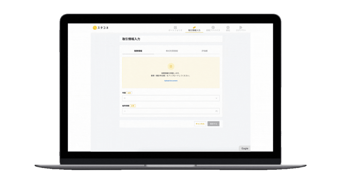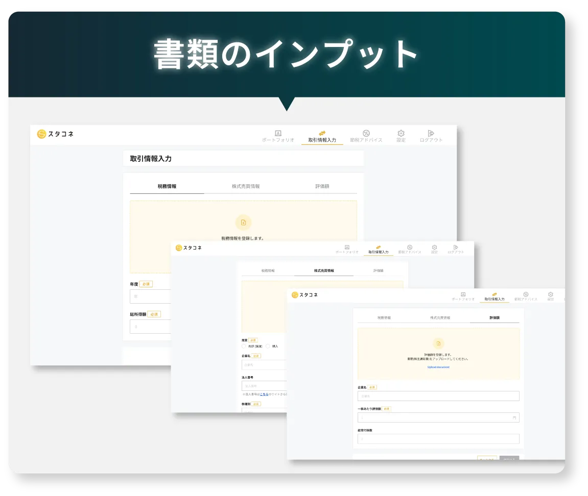株式の売買契約書や過去の確定申告書などのPDFをアップロードすることで、投資日・株数・金額・評価額などの情報をAIが自動で読み取り、登録します。 ※読み取り後の内容は、ユーザー自身で確認・修正が可能です。