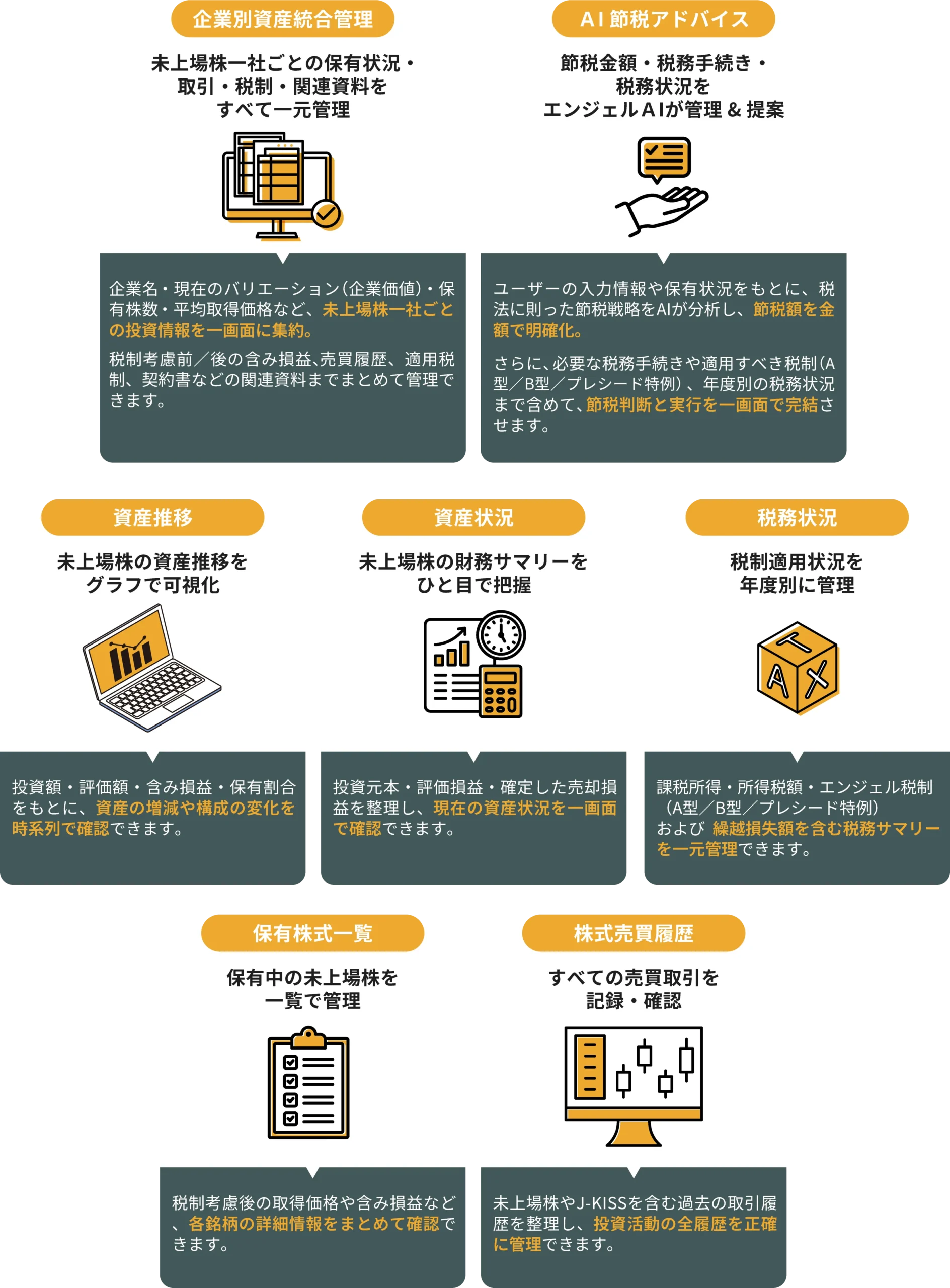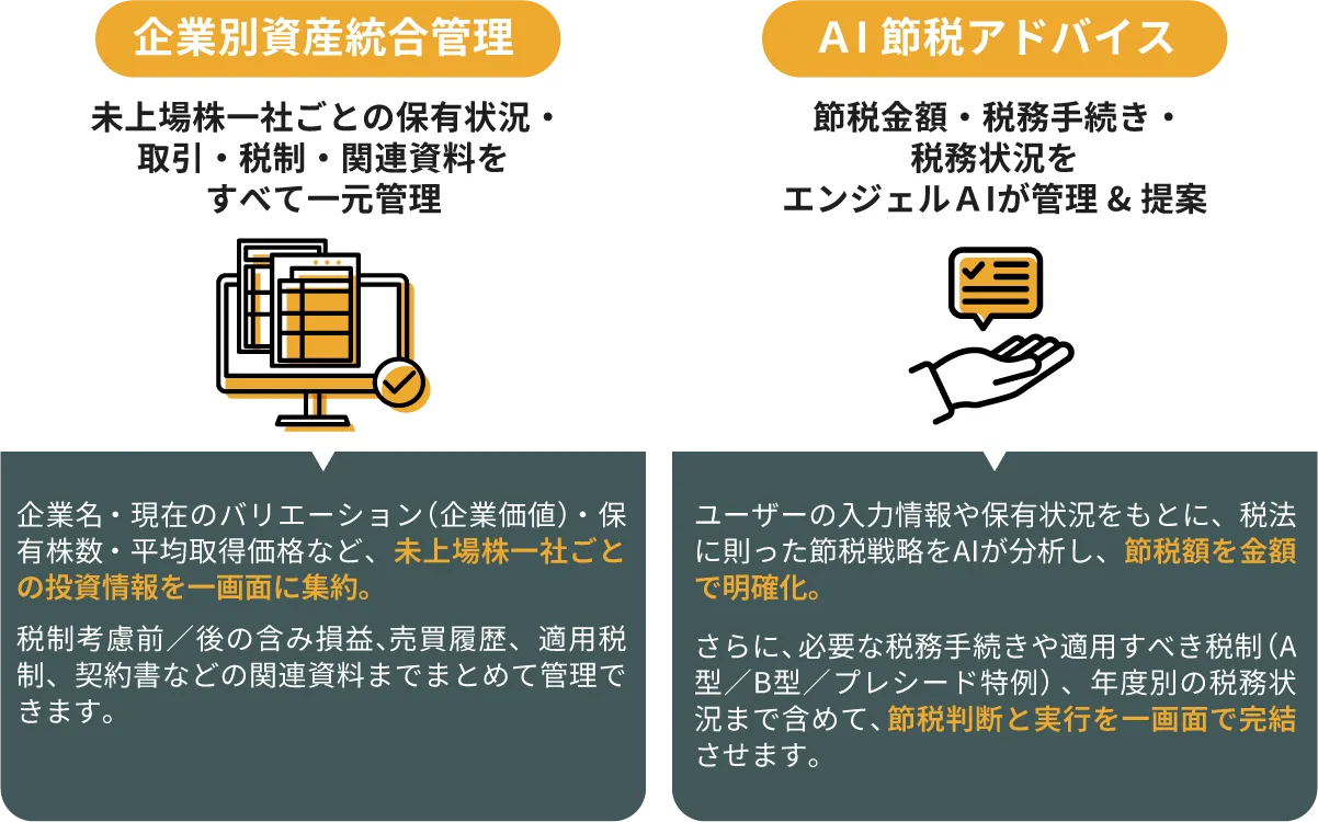 エンジェルAIは、これまで手作業で行っていた 契約書の整理・投資履歴の管理・税制チェック を自動化。 複雑な未上場株の管理を、誰でも簡単に扱えるようにします。