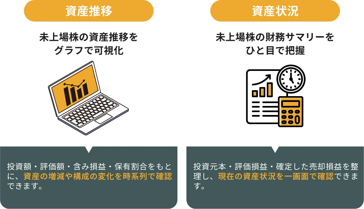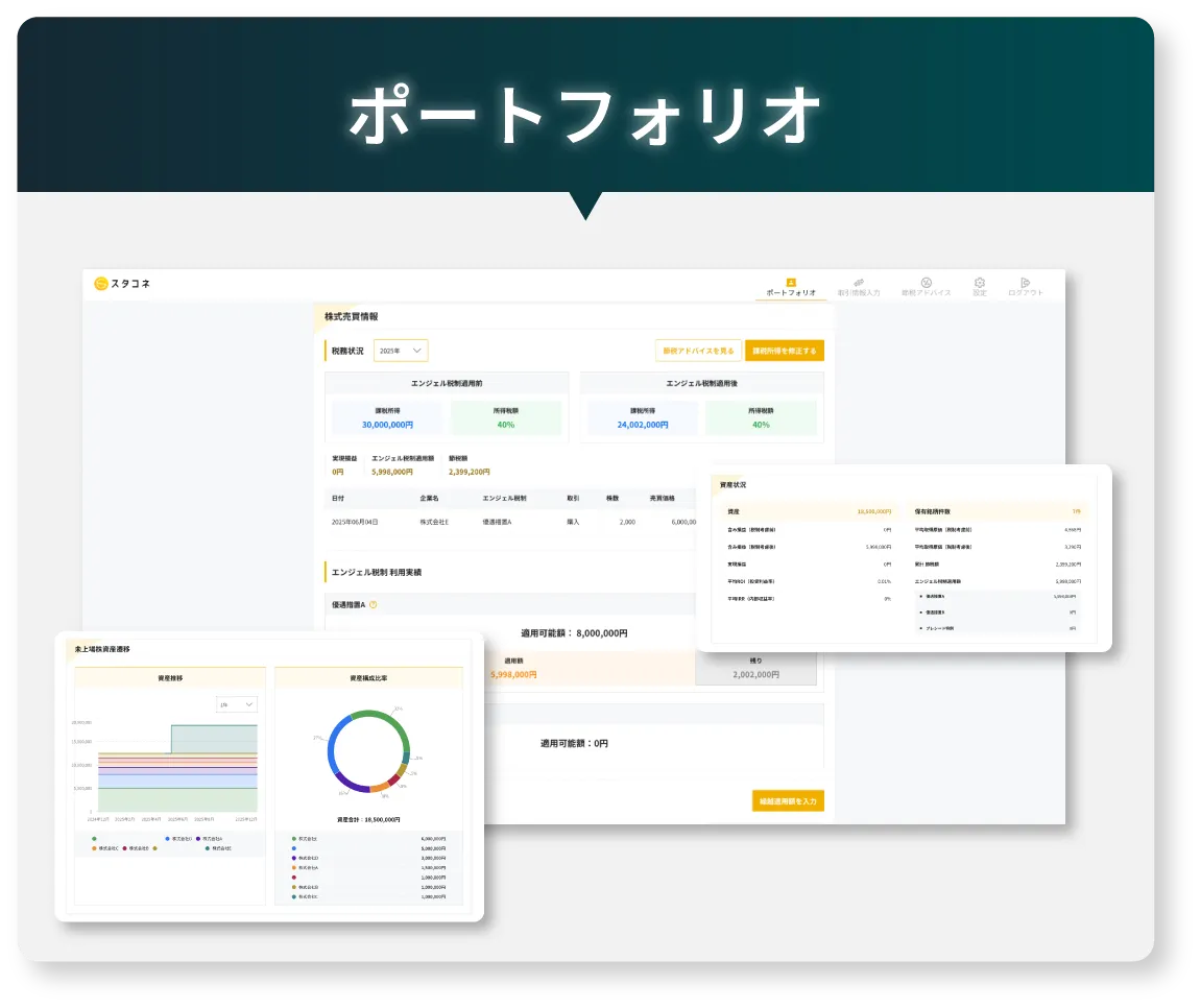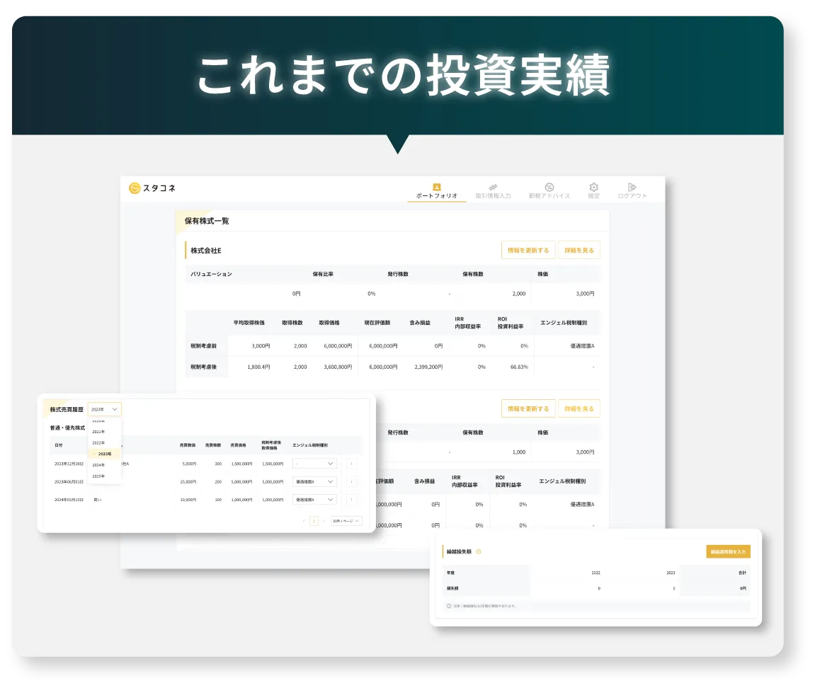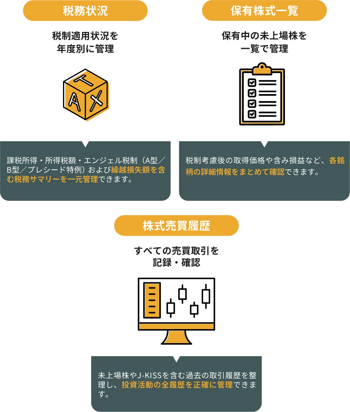 企業名、現在のバリエーション(企業価値)、保有株数、平均取得価格といった基本情報に加え、税制考慮前/後の含み損益、売買履歴、適用したエンジェル税制、契約書などの関連資料まで、未上場株一社ごとの投資情報を一画面で管理できます。