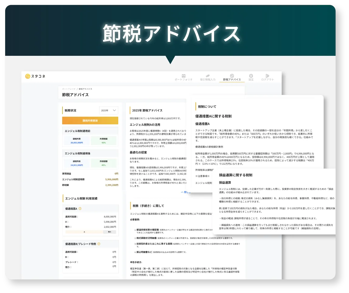 はい。アドバイスで使用されたエンジェル税制(A型/B型/プレシード特例)や専門用語については、制度の概要や考え方を分かりやすく解説しています。 税制に詳しくない方でも、内容を理解しながら判断できる設計です。